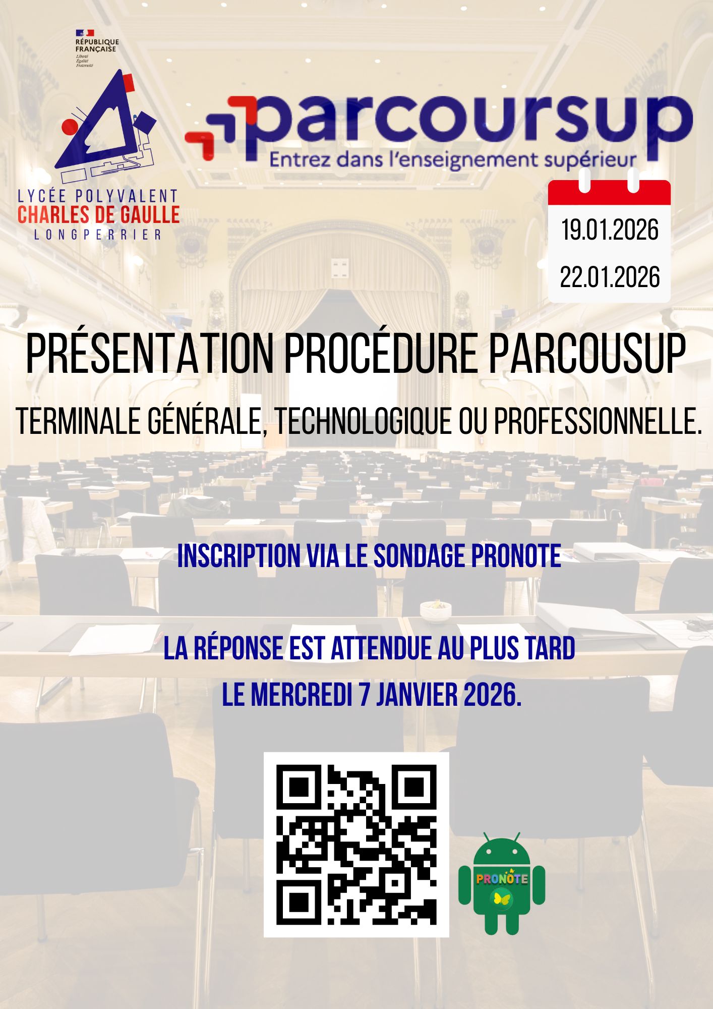 Dans le cadre de l’accompagnement à l’orientation, le lycée organise deux séances de présentation détaillée de la procédure Parcoursup destinées à l’ensemble des élèves de Terminale Générale, Technologique et Professionnelle.