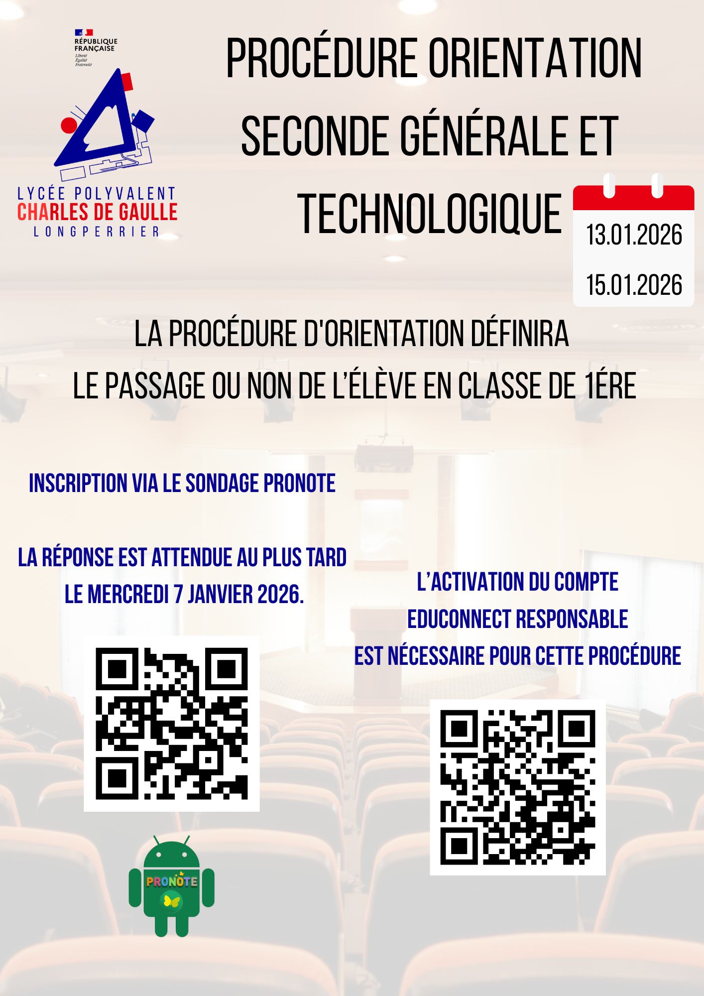 Dans le cadre de l’accompagnement des élèves de Seconde Générale et Technologique vers le passage en Première, le lycée organise deux réunions d’information dédiées à la procédure d’orientation en 1ère.