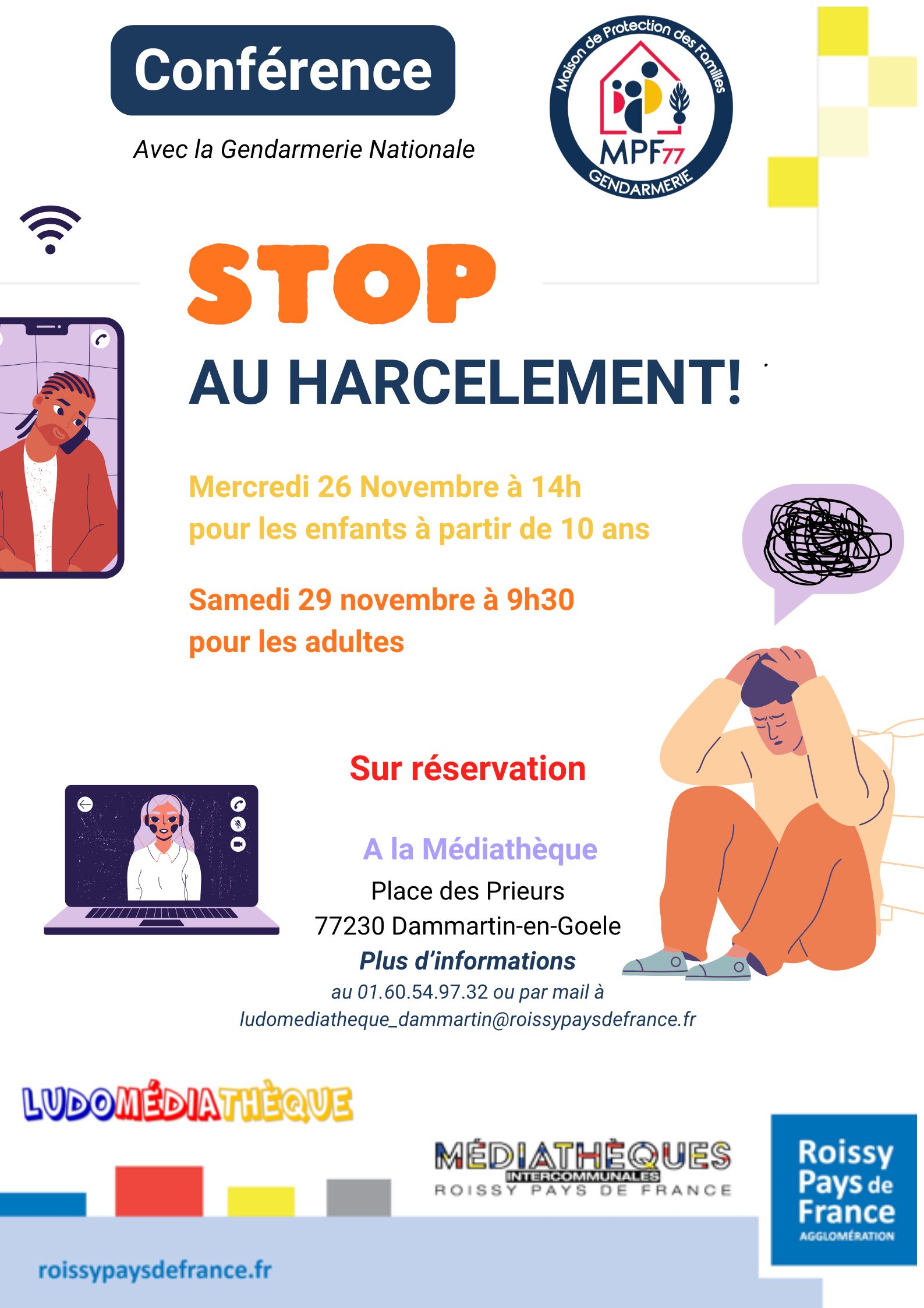 Une conférence avec la Gendarmerie Nationale sur le thème du Harcèlement aura lieu le mercredi 26 novembre à 14h pour les enfants à partir de 10 ans, et le samedi 29 novembre à 9h30 pour les adultes sur réservation à la Médiathèque de Dammartin en Goële.